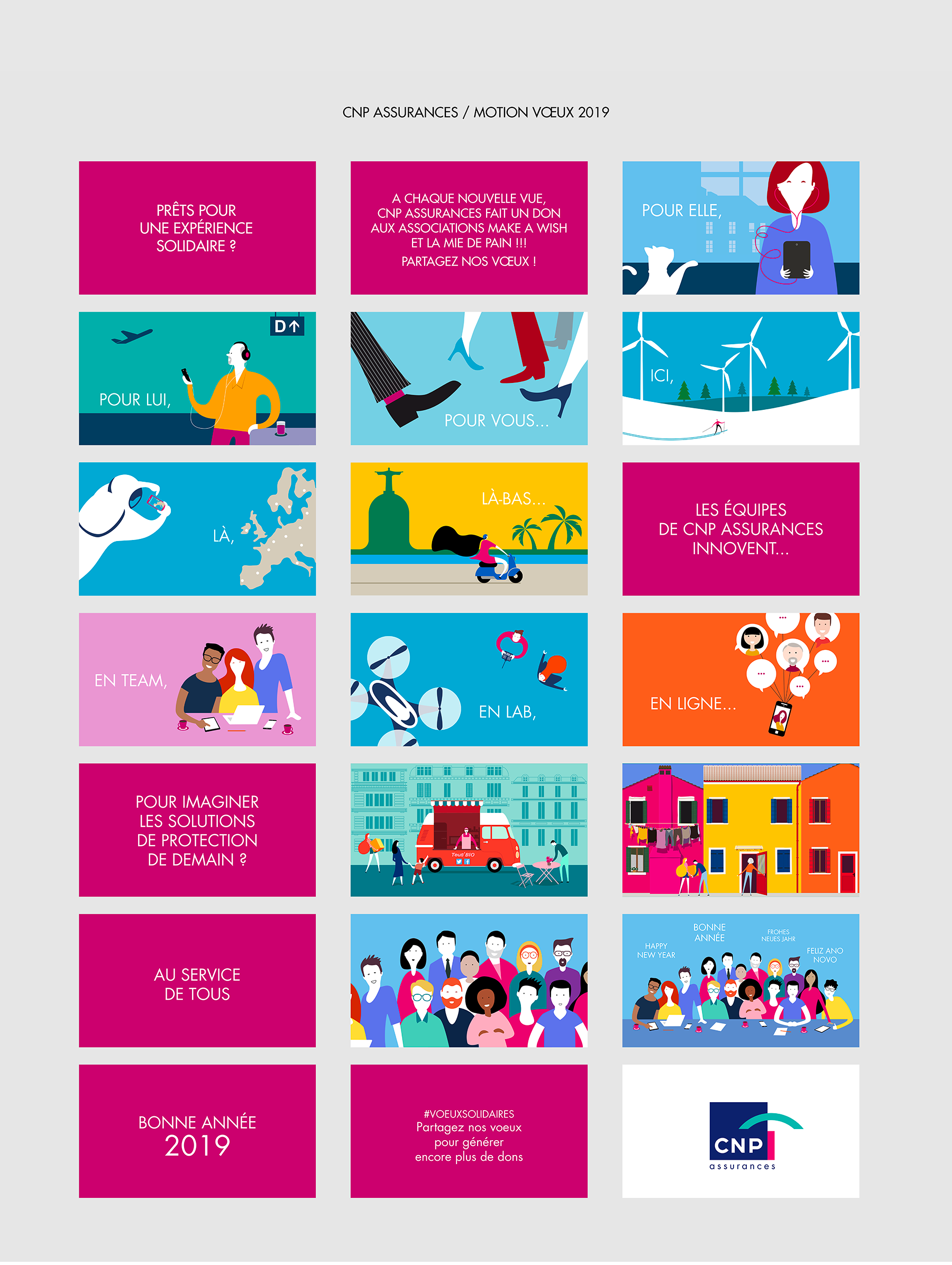 Design de storyboard et suivi de production pour CNP Assurances. Création d'une animation pour les vœux de l'année 2019 Illustrateur. Wood I Client Havas Paris